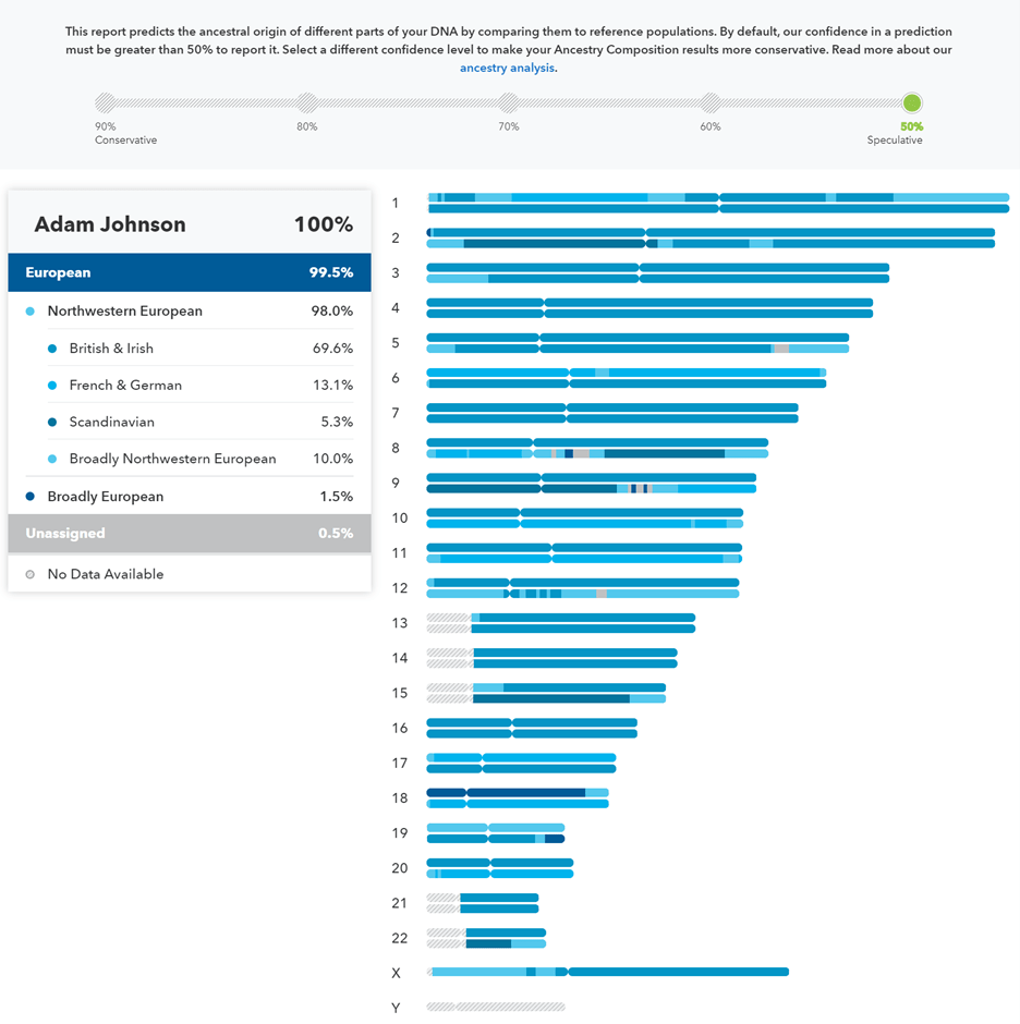 This geno-colonization erases the embodied experiences of the deceased and reduces their and living people’s identities to relationships between molecules; histories are lost in favor of comparing As, Ts, Cs, and Gs. When one receives their ancestry composition from a GATs service, it will include percentages of predicted relatedness to certain nations, regions, and groups. To illustrate, my most recent ancestry composition report from 23andMe states that I am 99.5% European (69.6% British & Irish; 13.1% French and German; 5.3% Scandinavian; 10% Broadly Northwestern European) and 0.5% Unassigned (Fig. 1). The first thing that should stand out is that it is presenting my ancestry relative to nations which of course are not static geographic regions but have shifted through human history (and did not always exist). What is not immediately evident though when seeing these data is the fact that what is being presented is based on a confidence level of 50% (Fig. 4). This means the story being told is not likely an accurate one. One can move the confidence interval and as the scale moves towards 90% confidence, the data being presented become less specific.