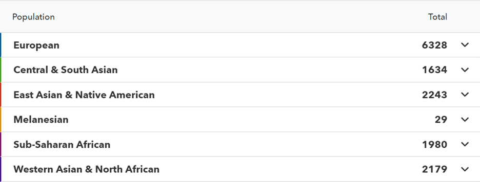 Fig. 5: This is a screenshot from 23andMe that indicates the number of samples used for analysis. Each category has a drop down menu that further specifies the samples.