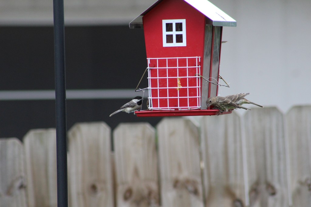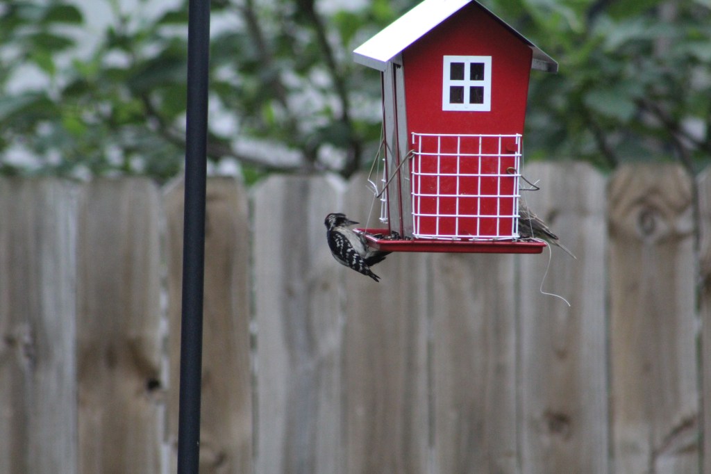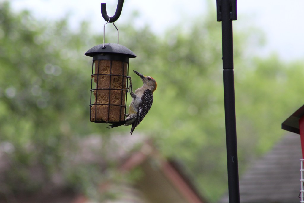 We have also added three bird feeders: one in the pollinator garden for seed, one in the pollinator garden for suet, and a window feeder on the picture window. For the moments when the white-winged doves aren’t trying to mob the feeder (which I have modified to deny them complete access to seed), it attracts goldfinches, house finches, cardinals, titmice, chickadees, sparrows, blue jays, and downy and gold-fronted woodpeckers. The suet attracts the woodpeckers, chickadees, and sparrows. The window feeder attracts all the small-bodied birds mentioned above.