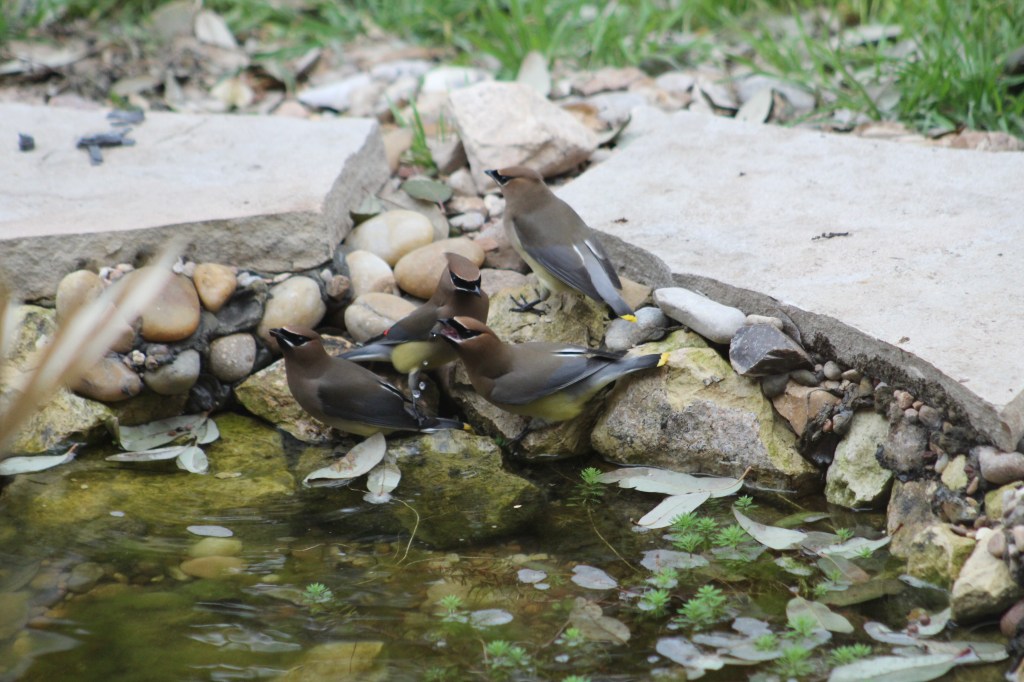 The pond has been a hit! We have mosquito fish that are friendly and keep the mosquito population down (at least in the pond). We also have pollywogs. Toads, rough earthsnakes, opossums, raccoons, neighborhood cats, and tons of birds visit the pond.