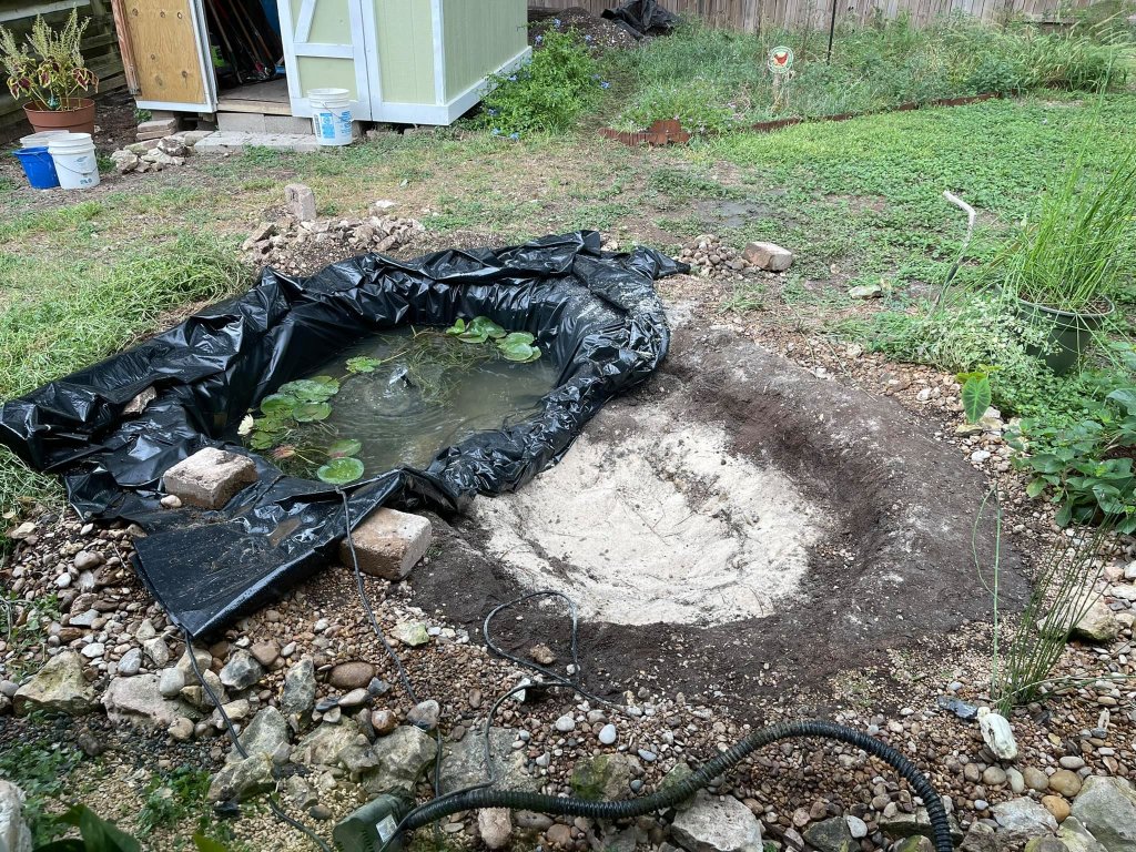Despite the pond’s success, it was too small to accommodate all the activity and the plants. I decided to expand the pond, which proved to be a challenging endeavor. First, I needed to empty half of the pond while keeping the fish and frogs safe. I emptied half of the water and pulled up the side of the pond with the waterfall. Next, I dug out the end of the pond, which would double the overall volume of the pond. I intended to extend the pond liner with seaming tape, but that did not work. Of course—because life cannot be east—I had to replace the liner with a larger size to accommodate my changes. This meant slipping the liner under the old liner, shifting the water into the newly expanded side, and removing the old liner. This was HARD, but my partner and I could transfer the water and critters to the new liner, remove the pea gravel and remaining water from the old liner and drag it out. You will be happy to know that after carefully examining the old liner, no fish or frogs were left behind.