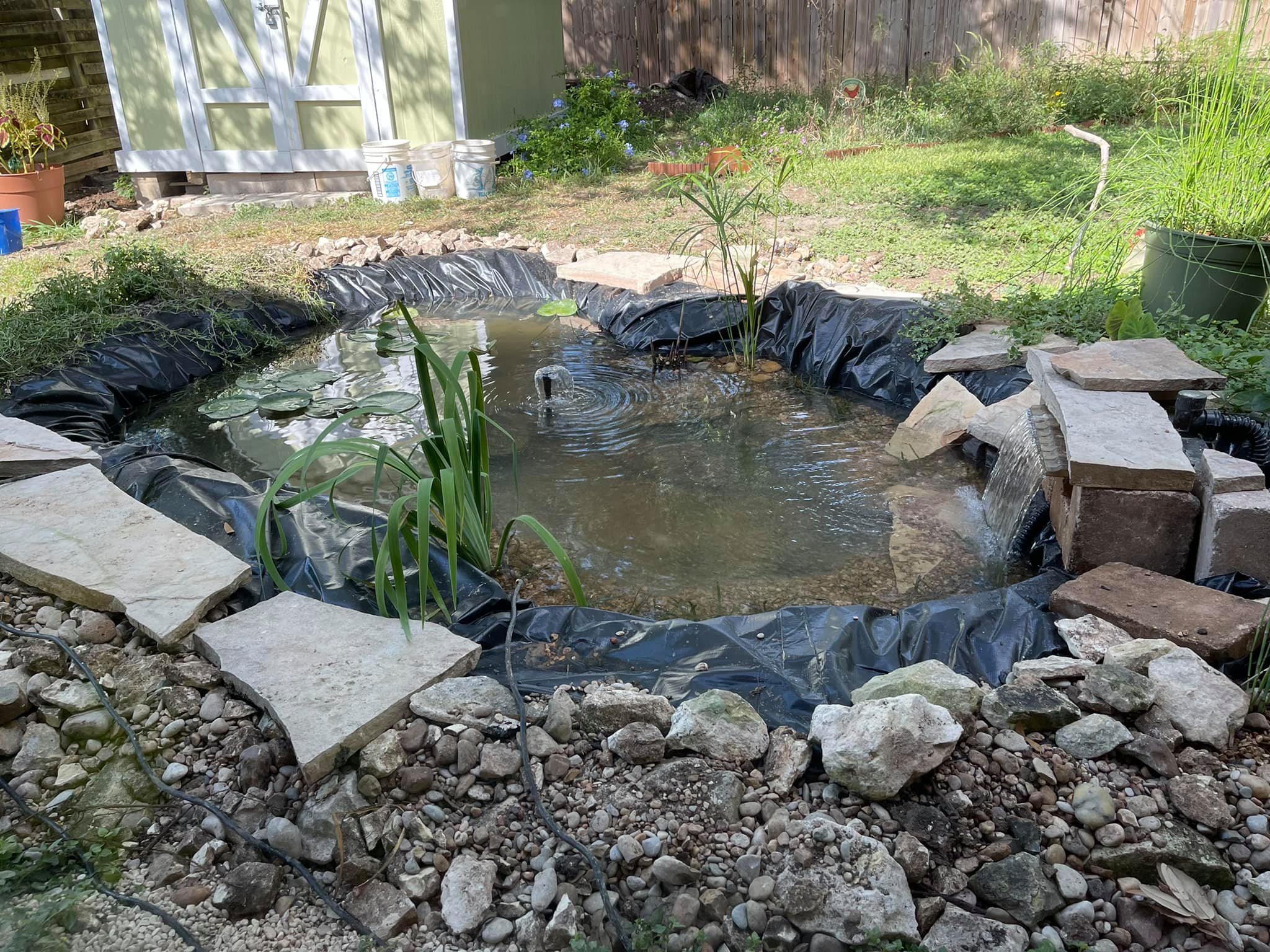 Once the hole was dug, I had to line it with a membrane so the water would not just seep into the soil. I used flagstones and river pebbles to hide the edge of the liner and planted an umbrella palm and horsetail reed. What we had was crude, but it was a start.
