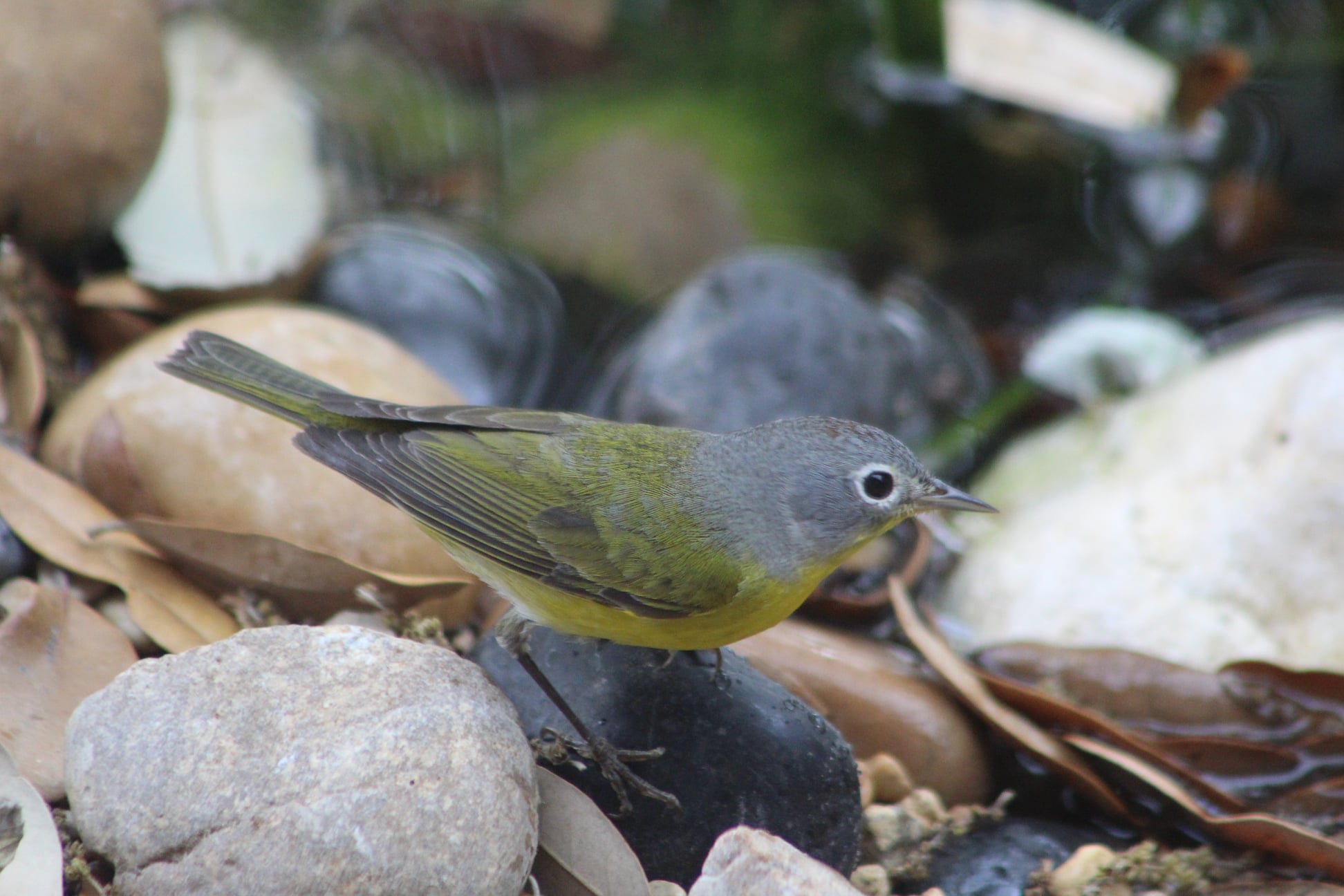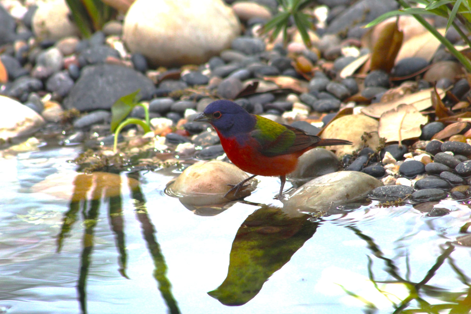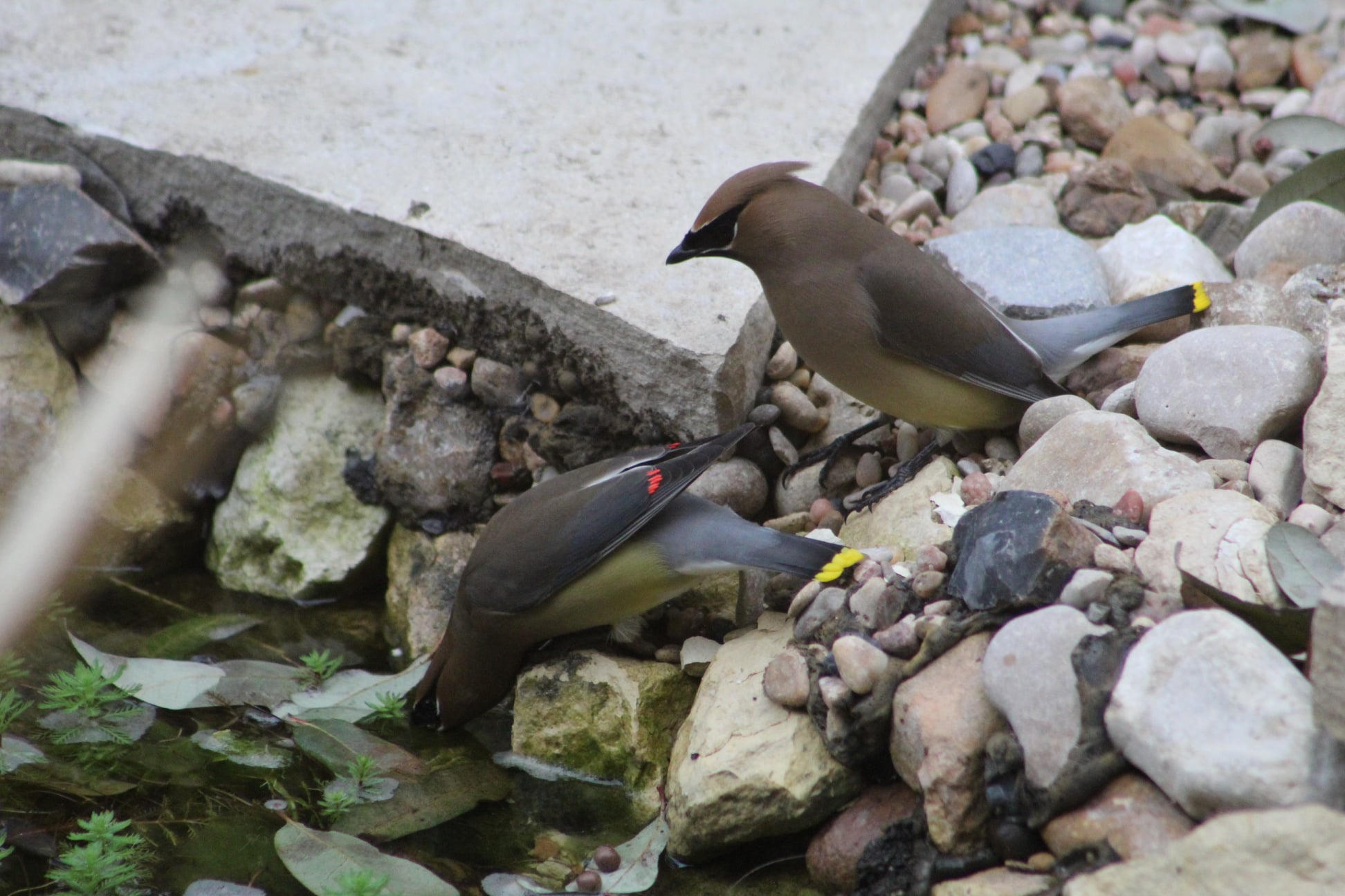 From there, I added a water lily, fountain, and a waterfall. The sound of water attracts birds, so this turned out to be a very smart decision—not just aesthetically—because this caused an explosion in the variety of species that paid us a visit2. Of course, there were common visitors: house finches, house sparrows, great-tailed grackles, and white-winged doves. However, we also had visits from migratory cedar waxwings, Wilson’s warblers, and even our resident red-shouldered hawks came in for a dip.